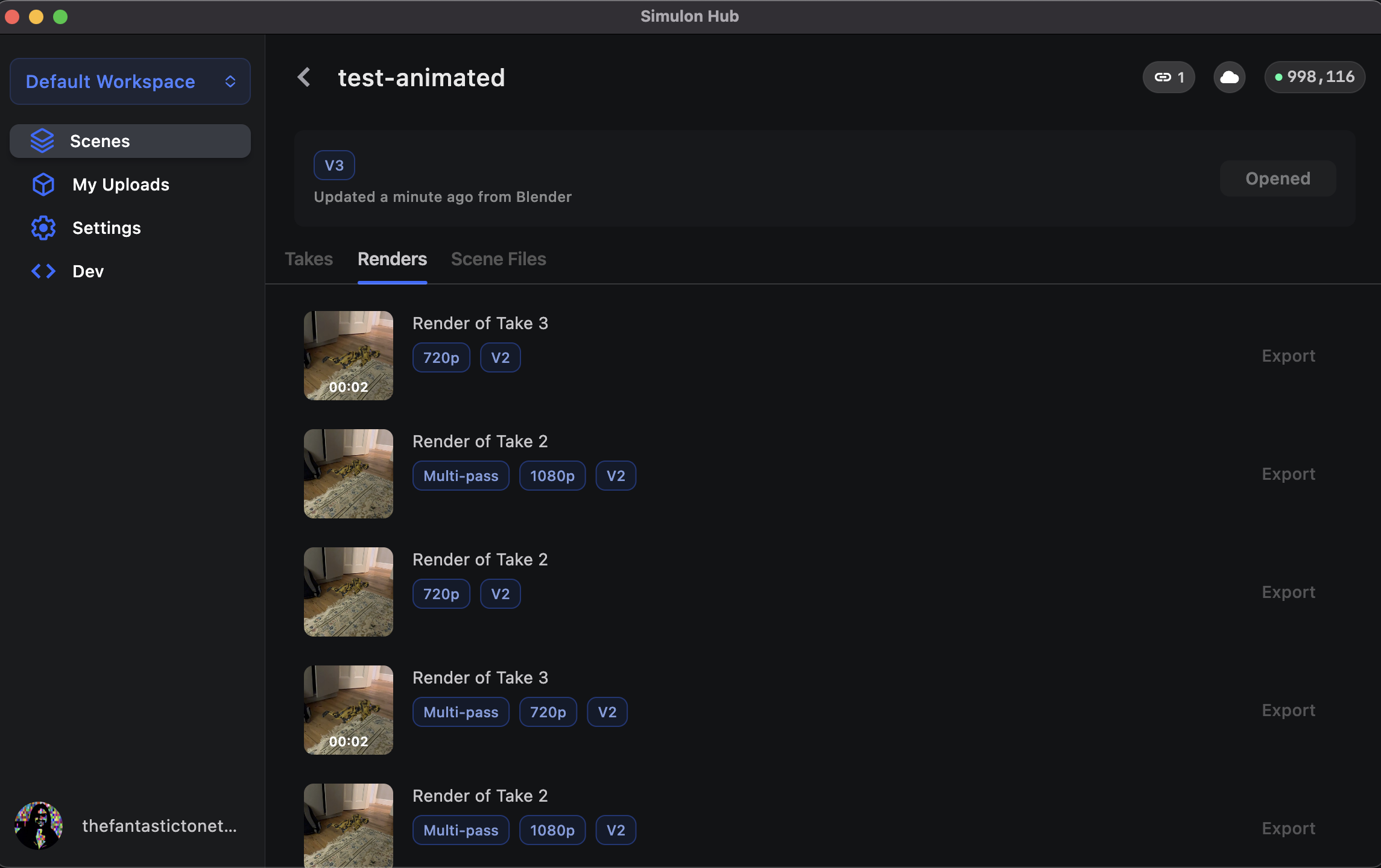 Simulon allows for any edits done to your scene in Blender to be synchronized back up to our cloud. This is a powerful feature which allows creators to make changes to the takes they have already created in post. This allows you to harness all the scene edit features of Blender in your renders. You can add particle systems, fog, clean up environment scan geometry and much more.&#x20;