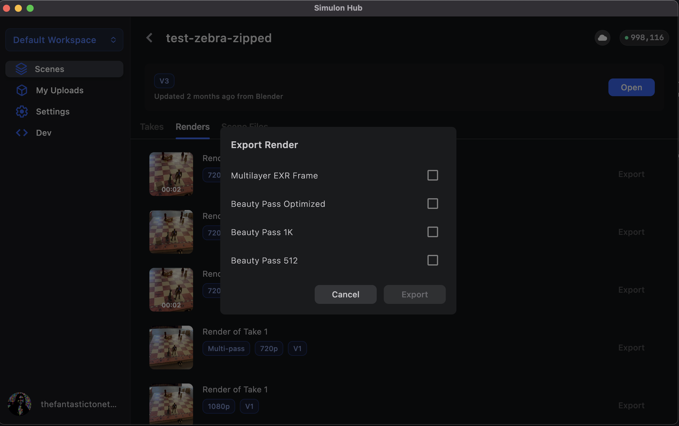 As mentioned in the [Takes](https://docs.simulon.com/hub/simulon-hub/takes#renders) renders section, mutiple renders can be created from a single take. The Renders tab allows you to view these and export them. You are able to filter for renders according to a take by selecting the take you'd like to find renders for before navigating the the renders tab.